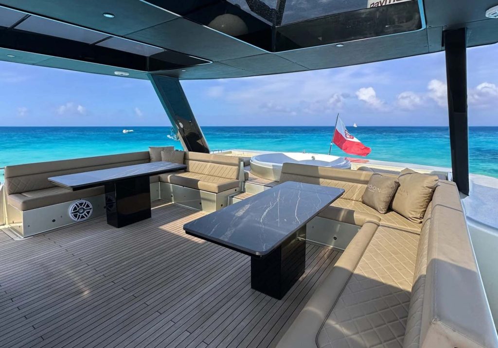 The interior of the Moon 6Ty Power dazzles with its space, offering the opportunity to create a unique atmosphere. All the cabinetry, upholstery, and furniture are made in our shipyard and are fully tailored to the future owner’s expectations, with finishing materials comprising a combination of refined fabrics, stones, and wood. Depending on the chosen layout, the main deck can accommodate a fully independent dining area, a lounge area with a large sofa, and a spectacular bar, or a well-equipped open kitchen. The cabins are spacious, bright, and feature private, beautifully finished bathrooms. The Moon 6Ty Power can be powered by engines ranging from 2x 225 to 2x 715 horsepower and offers speeds of up to 20 knots. A hybrid version of this yacht is also available.