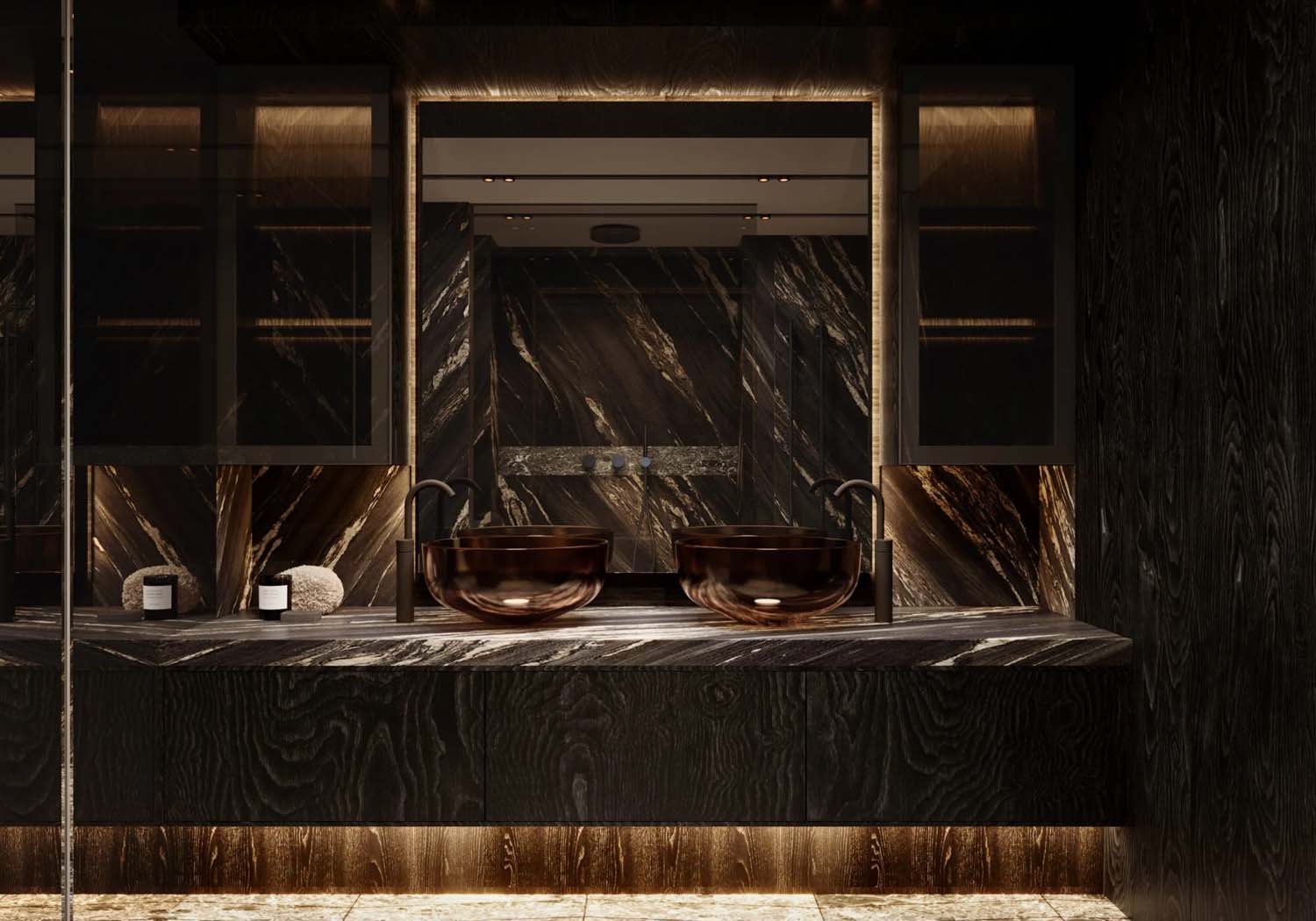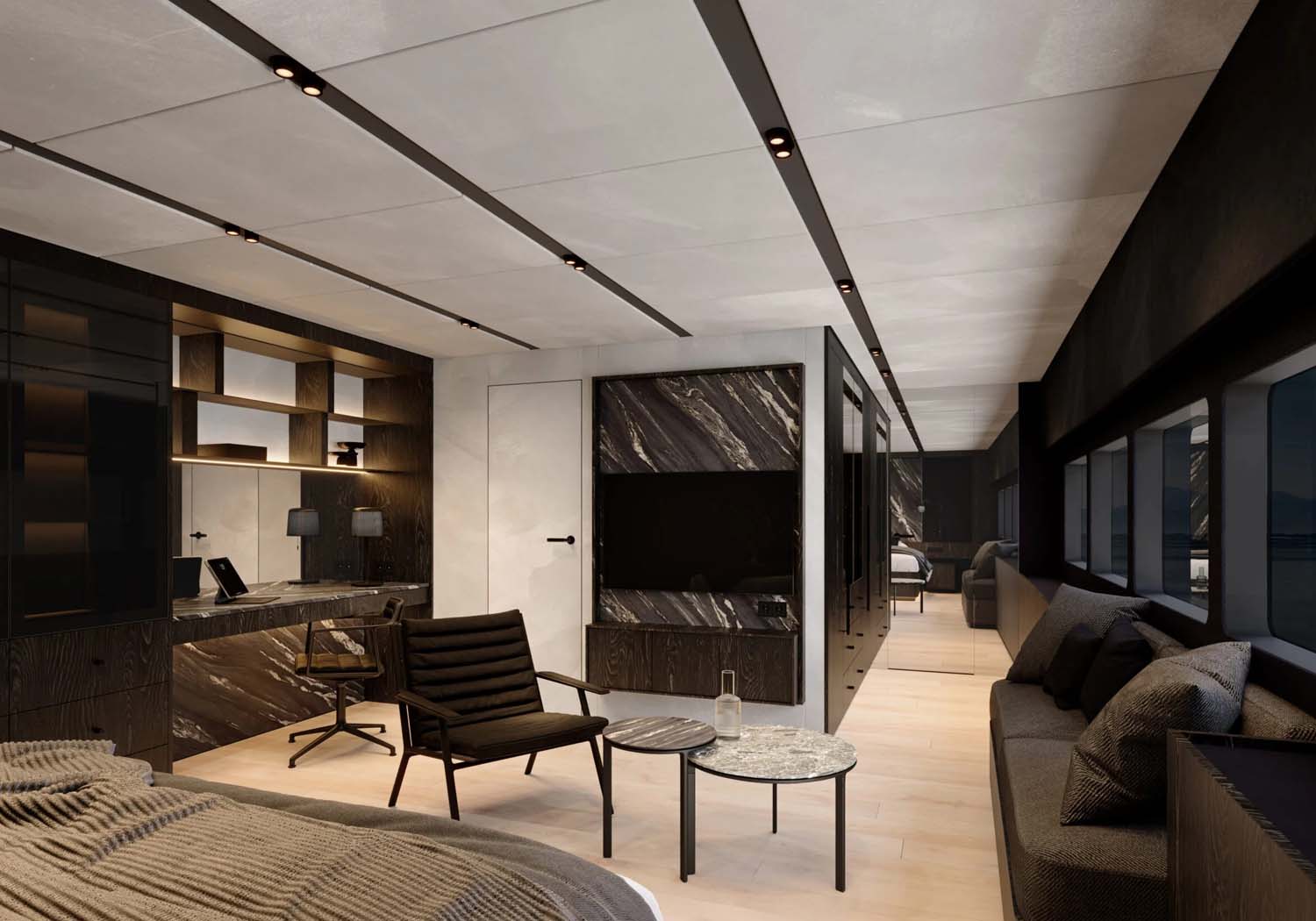 All cabins are very spacious and finished with attention to the smallest details, have private bathrooms or staterooms, and the owner’s cabin can also be equipped with a hydraulically opening balcony. The huge aft cockpit provides all the functionality of an upscale open-air lounge – a large table for formal dining, plenty of space for lounging, and a fully equipped bar – and blends seamlessly with other areas of the main deck, allowing them to merge into one cohesive whole. Aft of the yacht are large bathing platforms, which, together with a hydraulically lowered platform, form a beach club making it easier to access the water and use all the water fun equipment, including two jet skis, for which we have created a lockable garage. The bow deck is a relaxation area with space for morning coffee or afternoon cocktails. Large couches, a bar and a sunbathing area allow you to enjoy your time outdoors and, while docked, to enjoy a casual atmosphere in a place invisible to passersby.